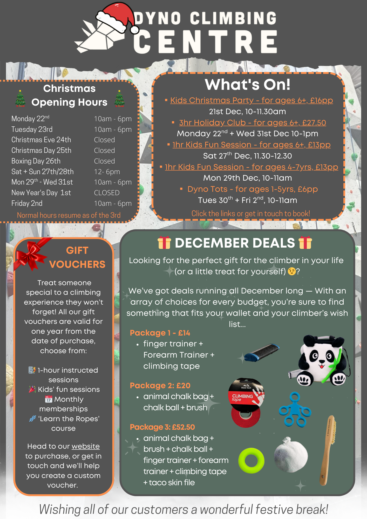 Join us @ Dyno for a festive 1.5-hour climbing session packed with themed games and Christmas climbing challenges! Itβs the perfect fun and active way to celebrate the season β and yes, seasonal jumpers are totally encouraged! π
